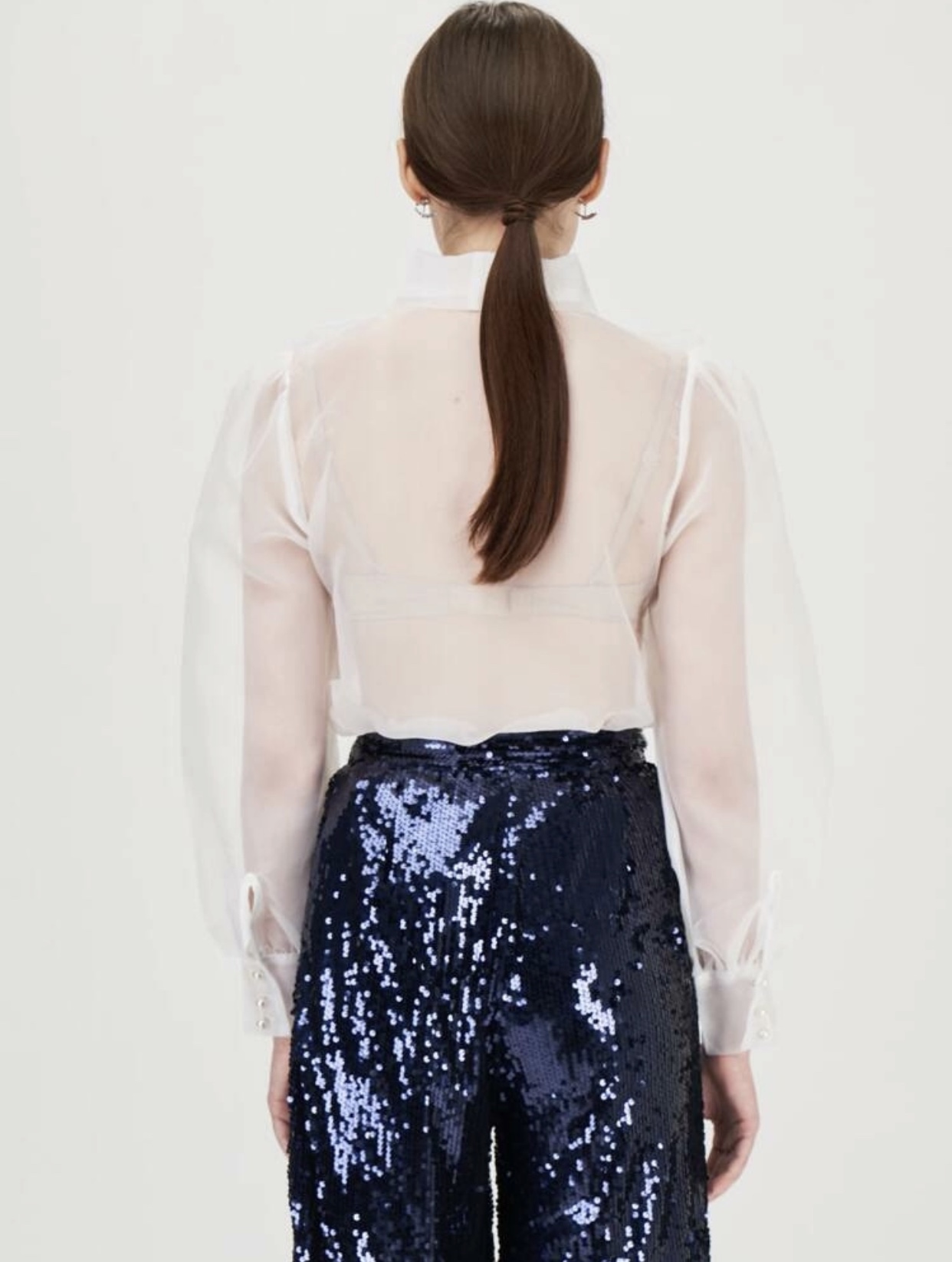 Camicia con collo annodato e manica a sbuffo trasparente